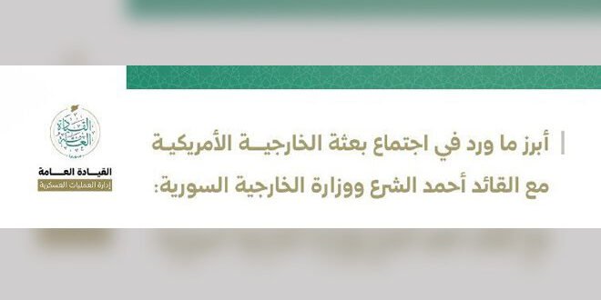 أعربت بعثة الخارجية الأمريكية خلال اجتماع مع القائد أحمد الشرع ووزارة الخارجية السورية عن تهانيها بتحرير سوريا والخلاص من النظام المجرم السابق، مؤكدة التزامها بدعم الشعب السوري والإدارة السورية الجديدة، والوقوف إلى جانبها في مواجهة الملفات العالقة والتحديات الكبرى، كمنطقة شمال شرق سوريا.