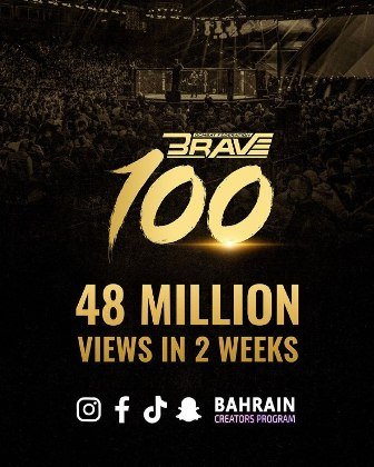 ومع اقتراب أسبوع النزال (Fight Week) لوصول المقاتلين والضيوف العالميين إلى مملكة البحرين، تتوقع BRAVE ارتفاعًا غير مسبوق في نسب المشاهدة، حيث تشير التقديرات إلى إمكانية تجاوز المحتوى 250 مليون مشاهدة في أول أسبوعين من نوفمبر، مع تغطية إعلامية مكثفة من منصات محلية ودولية.
