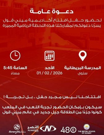 في خطوة تعكس الحراك الرياضي المتنامي في دولة الكويت، أعلنت لجنة ميني قول عن الافتتاح الرسمي لأكاديمية Mini Goal، وذلك مساء يوم الأحد 1 فبراير 2026 في تمام الساعة 5:45 مساءً، على ملاعب المدرسة البريطانية بالكويت – منطقة سلوى، قطعة 1، وسط أجواء احتفالية ورياضية مميزة.